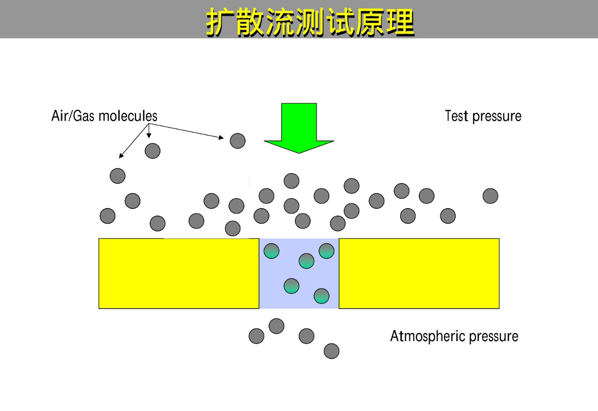扩散流测试基于溶解-扩散模型。当滤膜被润湿液体完全润湿后,如果在过滤器的上游存在压缩气体,而该压缩气体的压力值又小于泡点压力时,滤膜仍然是完全润湿的。由于压缩气体一侧的气体浓度会高于常压一侧,此时气体分子会从高压测溶解到润湿液体中并扩散至常压测,如果在下游接一根管子会发现有气体缓慢流出,这就是扩散流,通过检测扩散流的完整性测试方法称为扩散流测试。气体的扩散符合Fick定律,扩散流量与滤膜两侧压差和膜面积成正比,为了消除测试压力不同所带来的影响,扩散流测试都在固定的压力下进行(通常为泡点值的80%)。以下为扩散流计算公式:
